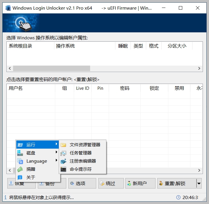 太久没有开电脑您居然忘记了windows开机登录密码怎么办?难道要重装系统?其实想要清除开机密码并不难,Windows Login Unlocker是一款PE下的重置Windows登录密码工具,在PE系统下运行即可帮您轻松绕过系统密码直接进系统或清除密码。